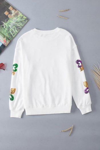 Women White Sequin Mardi Gras Graphic Pullover Sweatshirt | Sweatshirts