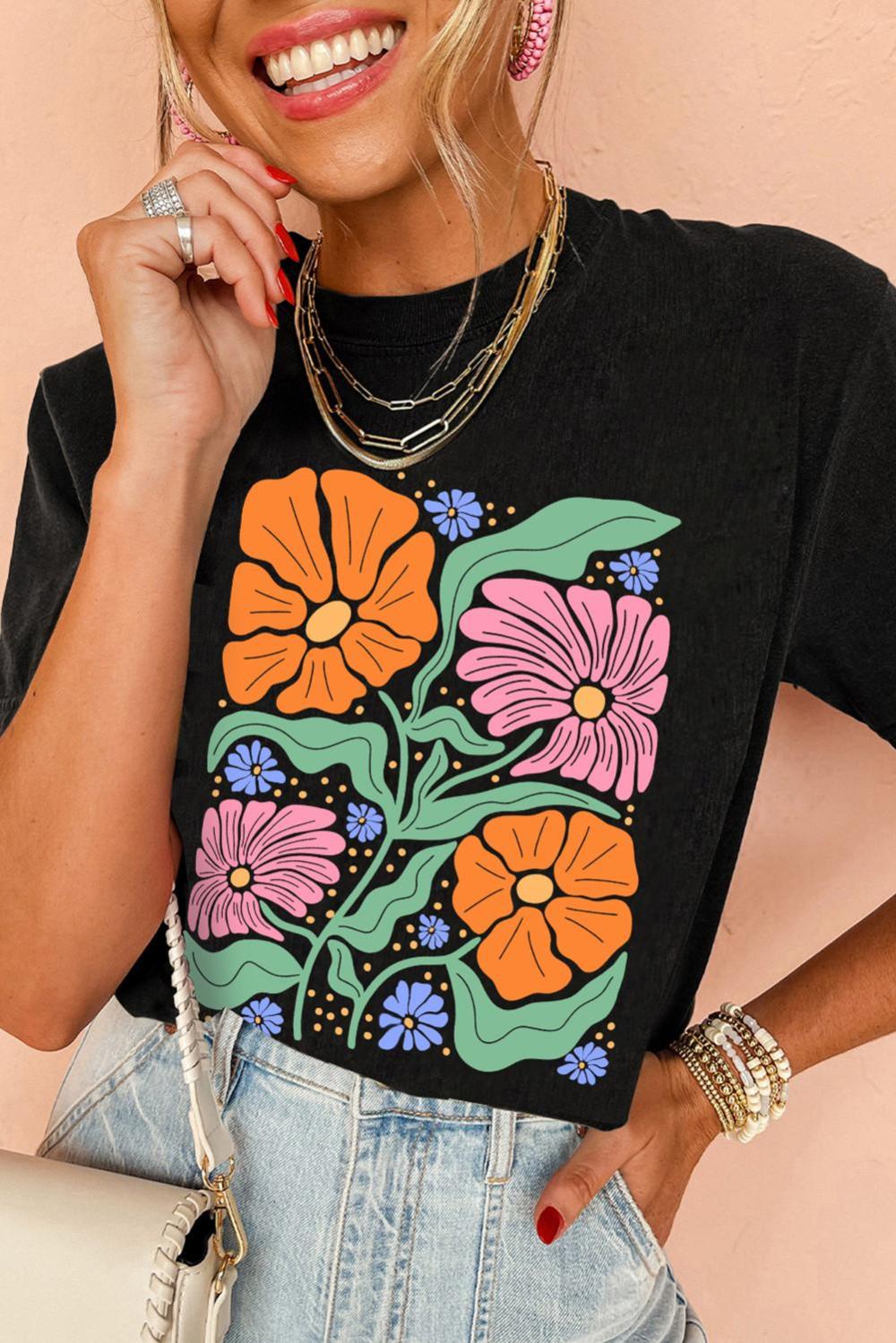 - The Black Color Pairs Easily With Any Bottoms, While The Floral Graphic Adds Standout Charm.