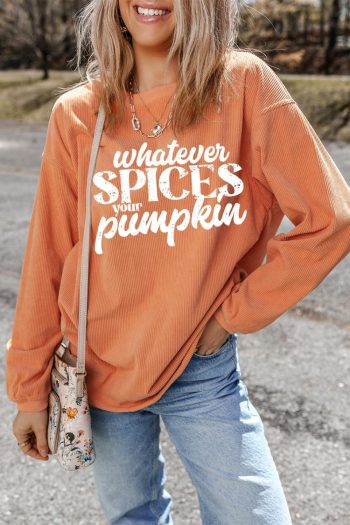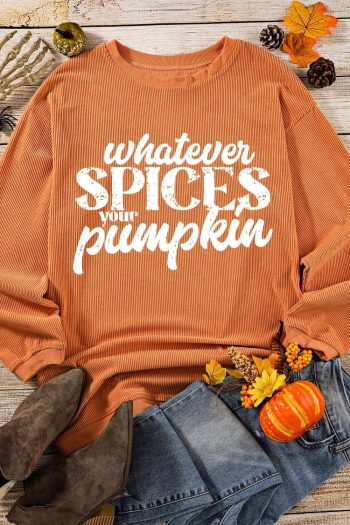 - "Whatever Spices Your Pumpkin" Graphic For A Fun And Quirky Touch To Your Outfit.